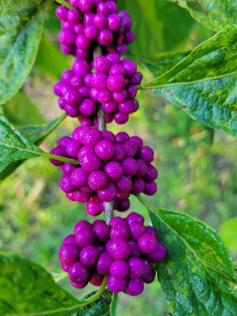 This is the American Beautyberry, and it grows everywhere. The fruit has a slight bitterness, good to eat, and the leaves make an effective bug spray, safe for the skin.