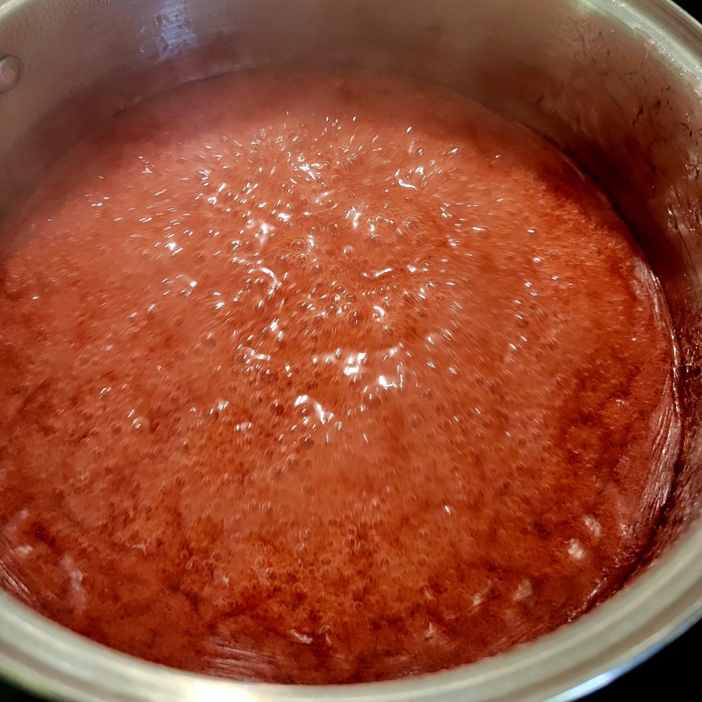 After a good wash & sort, I was left with 2 cups of berries. Into the pot with about 3 cups of water (I didn’t measure, my apologies), brought to a boil.